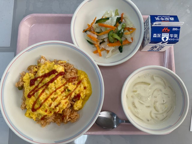 給食では、チキンライスの上に、とろっとしたスクランブルエッグをかけてオムライスのようにして提供しました。クリーミーな卵とケチャップの酸味の効いたチキンライスがよく合い、生徒たちに喜ばれました。